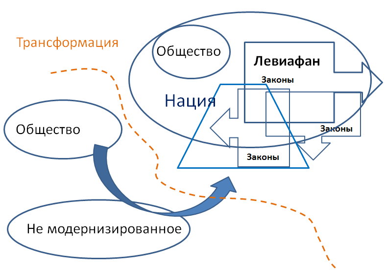 И Общество, завтра, — это уже Нация, определенная политическим стремлением, стремлением к модернизации. А сам процесс модернизации будет определен Левиафаном.