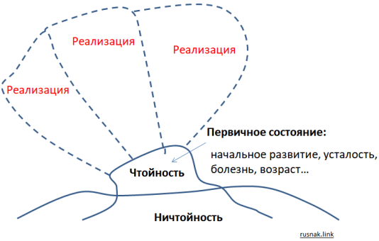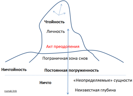 И всегда остается открытым вопрос: как акт преодоления связан с миром чтойности? Как существует постоянное погружение в ничтойность? Что оттуда приходит, ничтойность одинакова для всех, она универсальна (всеобща) или нет? И что это за погружение? А что находится за ничтойностью? Что такое погружение в поле смысла или не только смысла? И почему оттуда может приходить разное, и разное там можно обнаружить?