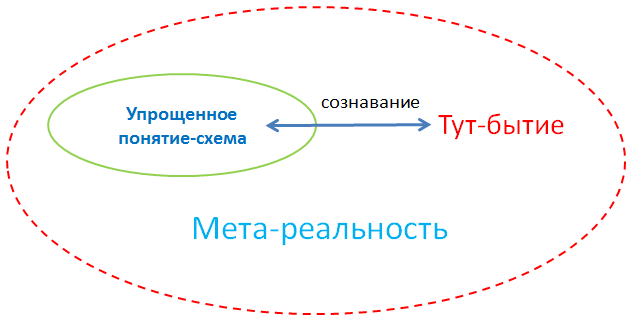 Но «то, что происходило-происходит» в качестве ЦЕЛОГО — это не схема. А это мета-реальность, которая это нечто действительное. И для обнаружения которой нужно просто опустить палец в горячую воду, узнав в такой миг (тут-бытия — Dasein), что это не схема — а что-то, но что? ЧТО? Реальность? Мета-реальность, которая не определяется: физической, химической, исторической выдумкой (схемой)?