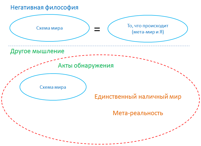 То есть рационализм, пантеизм, деизм, или что-то другое схематическое — это только способ «определить действительность в схему», и таким образом как бы «понять то, что происходит». Но любая попытка следующего «схватывания схемы» «в качестве того, что происходит» — это вызывает негативность и ощущение неадекватной пустоты такого мышления (каждый может попробовать определить присутствие схемой, и?).